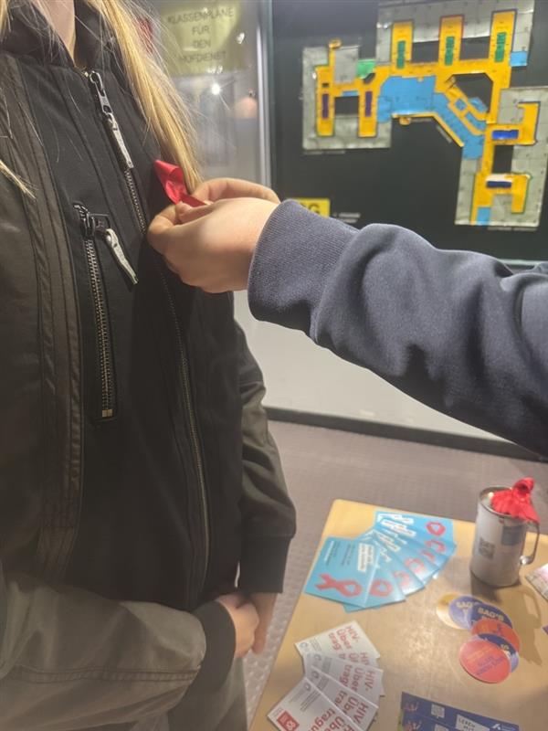 Ein Großteil unserer Schulgemeinschaft trug an diesem Tag die rote Schleife – ein internationales Symbol für Solidarität, Respekt und den Kampf gegen Diskriminierung. Viele nutzten dieses Zeichen bewusst, um miteinander ins Gespräch zu kommen und Unterstützung zu zeigen.