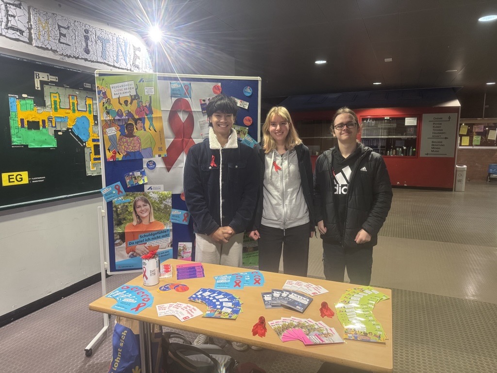 Zum Welt-AIDS-Tag am 1. Dezember brachten sich die Schüler:innen mit großem Engagement in das Schulleben ein. An einem Informationsstand suchten sie vor Unterrichtsbeginn sowie in den kleinen Pausen das Gespräch mit Mitschüler:innen und Lehrkräften, beantworteten Fragen und stellten Materialien zur Verfügung. Durch ihren Einsatz leisteten sie einen wichtigen Beitrag, um Vorurteile abzubauen und Aufklärung zu fördern.