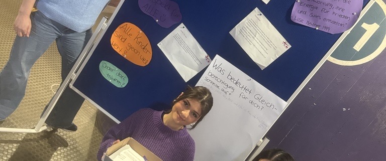 Außerdem informierte eine Stellwand mit spannenden Fakten und Informationen über den Weltfrauentag. Die Schüler:innen hatten zusätzlich die Möglichkeit, aufzuschreiben, was Gleichberechtigung für sie persönlich bedeutet. Viele nutzten diese Gelegenheit und teilten ihre Gedanken und Wünsche. Unter anderem wurde geschrieben, dass alle Menschen gleich sind, dass jeder Mensch auf seine eigene Art perfekt ist und dass alle respektiert werden sollten.