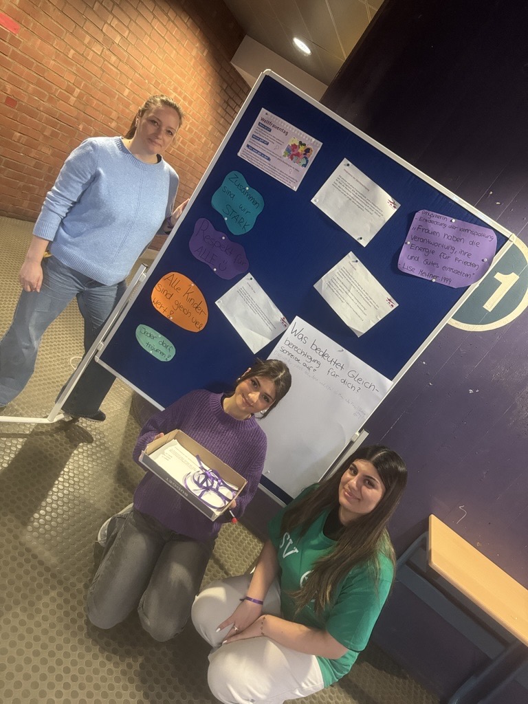 Anlässlich des Weltfrauentages organisierte die Schüler:innenvertretung gemeinsam mit den Ansprechpartnerinnen für Gleichstellungsfragen am 9. März 2026 eine Aktion in den großen Pausen. Dabei wurden lila Bändchen verteilt, um auf das Thema Gleichberechtigung aufmerksam zu machen und ein sichtbares Zeichen zu setzen.